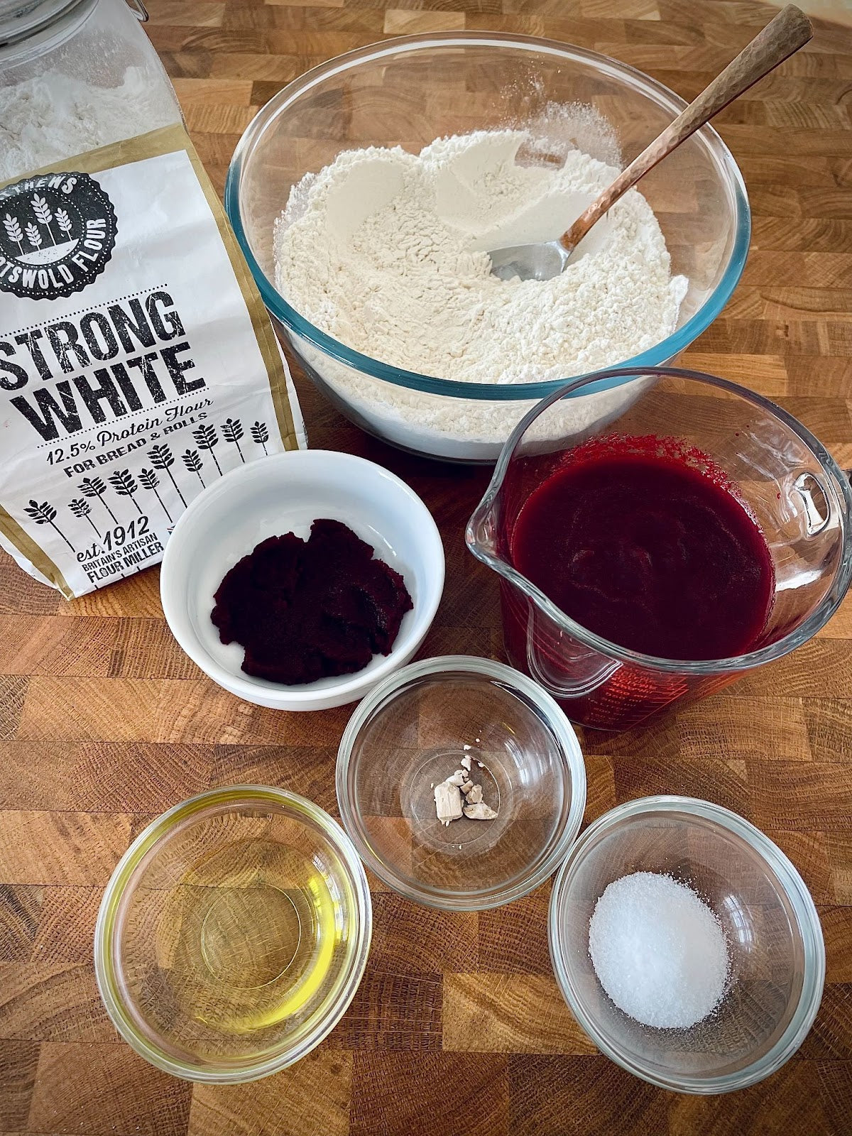 - Cover with a damp tea towel and leave for 1 hr to allow the flour to absorb the beetroot juice.