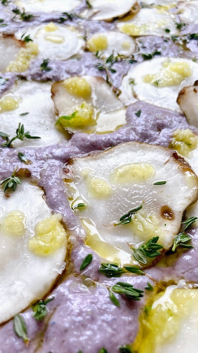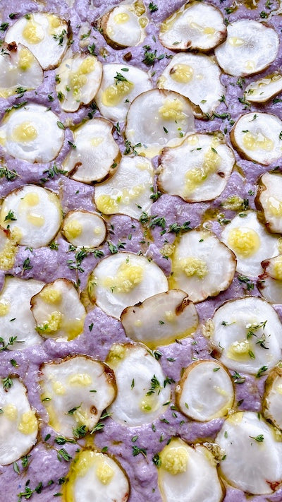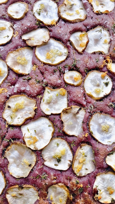 No-knead overnight Purple Potatoes and Jerusalem Artichokes Focaccia