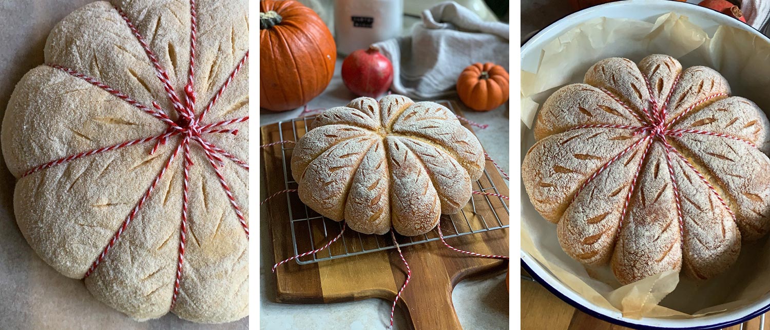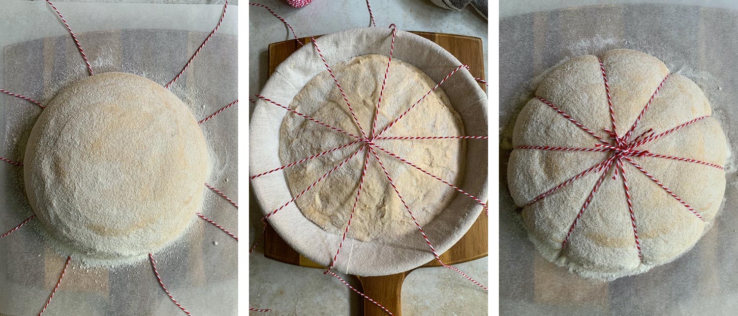 Now place your string in position over your dough. When you have it where you want it to place the parchment paper on top then the board so you can turn it over ready to tie for your pumpkin shape. Then tie each piece of string individually, tight enough but with enough room for the bread to rise. When this is all finished score your pumpkin any way you want.