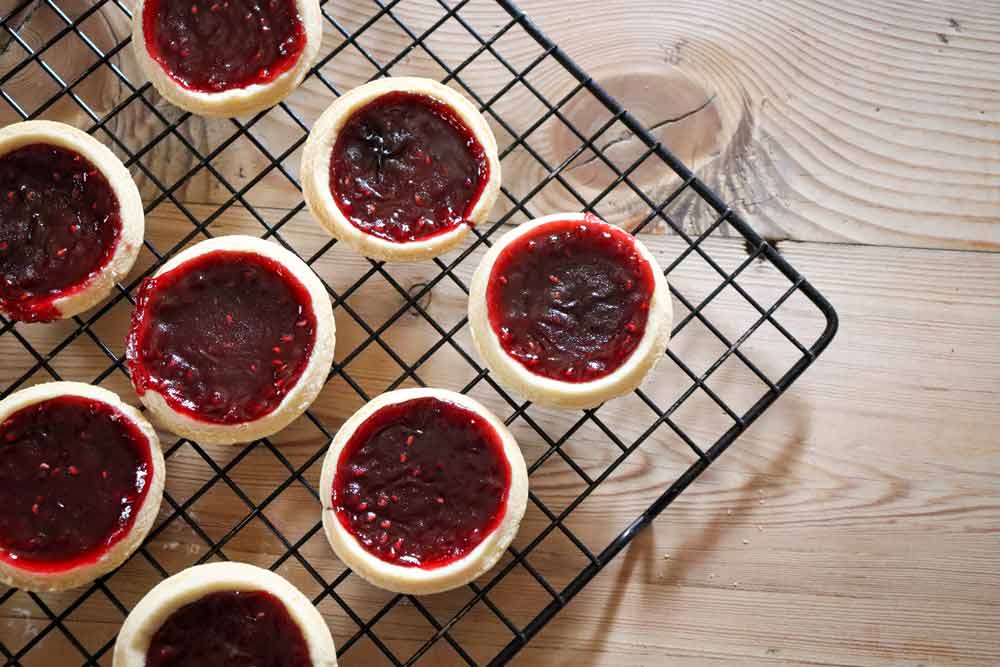 - Place a teaspoon of jam into each of your pastry cases, and try to remember that less is more in this example! Too much jam will bubble over and cause your tarts to stick to the tins.