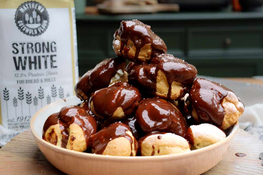 A delightfully decadent dessert – puffs of pastry stuffed with sweetened double cream and smothered in hot chocolate sauce! This epic sweet treat only takes thirty minutes to prep and 20 to bake, so it’s a great option when you need to whip something up in a hurry. Made using our Strong White Bread Flour, Sophie Carey’s easy to follow 9-step method is ready for you to try below!