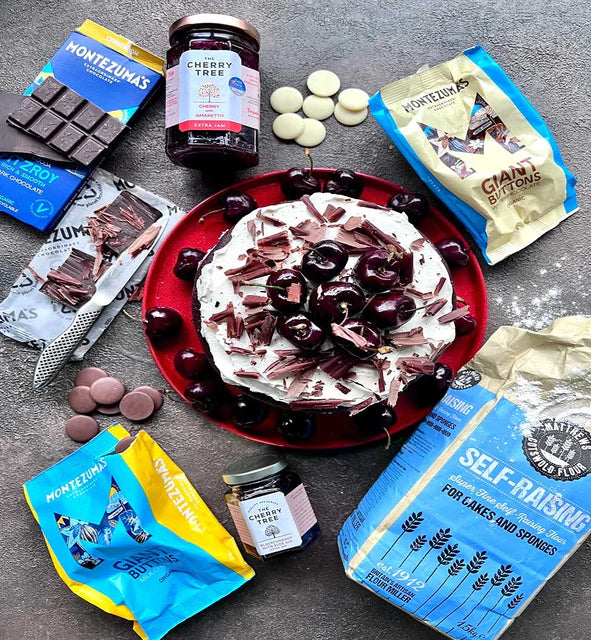 How about making your Valentine this insanely decadent, fudgy ‘brownie’ cake, with dark chocolate, milk chocolate buttons, a zingy layer of Cherry Amaretto jam and white chocolate mascarpone cream..