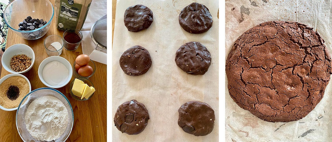 Cream the butter & sugar together with the molasses, then add the eggs, one by one, then add all the sieved dry ingredients, and the vanilla, mix this for a minute followed by the melted chocolate. Mix till combined, then roll into 60g balls and press lightly down on a baking parchment on a baking tray. Place into the oven at 200c for 8-10 mins only so they stay goey, place onto wire rack to cool.