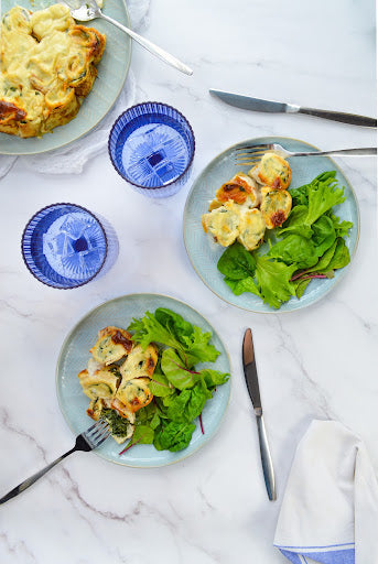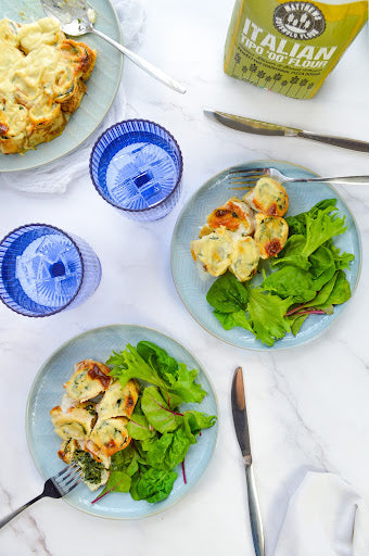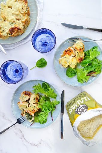 - Place all the rolled-up and cut pancakes in an ovenproof dish, greased with some butter, and cover with the bechamel sauce.