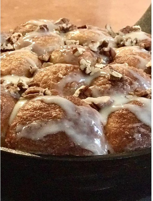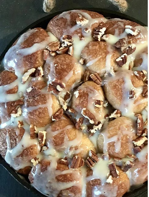 - Generously butter a 10-inch cast iron pan. Dust the bottom of the pan with half of the sugar mixture. Add dough balls one at a time to bowl with remaining sugar mixture; turn to coat. Arrange balls in an even layer in a cast iron pan. Pour cooled honey mixture on top and cover loosely with plastic wrap; let stand in a draft-free location until risen to the top of the pan, about 1 to 2 hours.