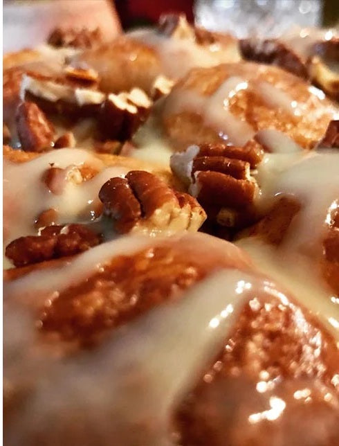 To finish off the Monkey Bread add 4 tbs. white chocolate crème fraiche & 4 tbs. toasted pecans, chopped. Then drizzle with softened white chocolate crème fraiche and finally top it off with pecans. Enjoy