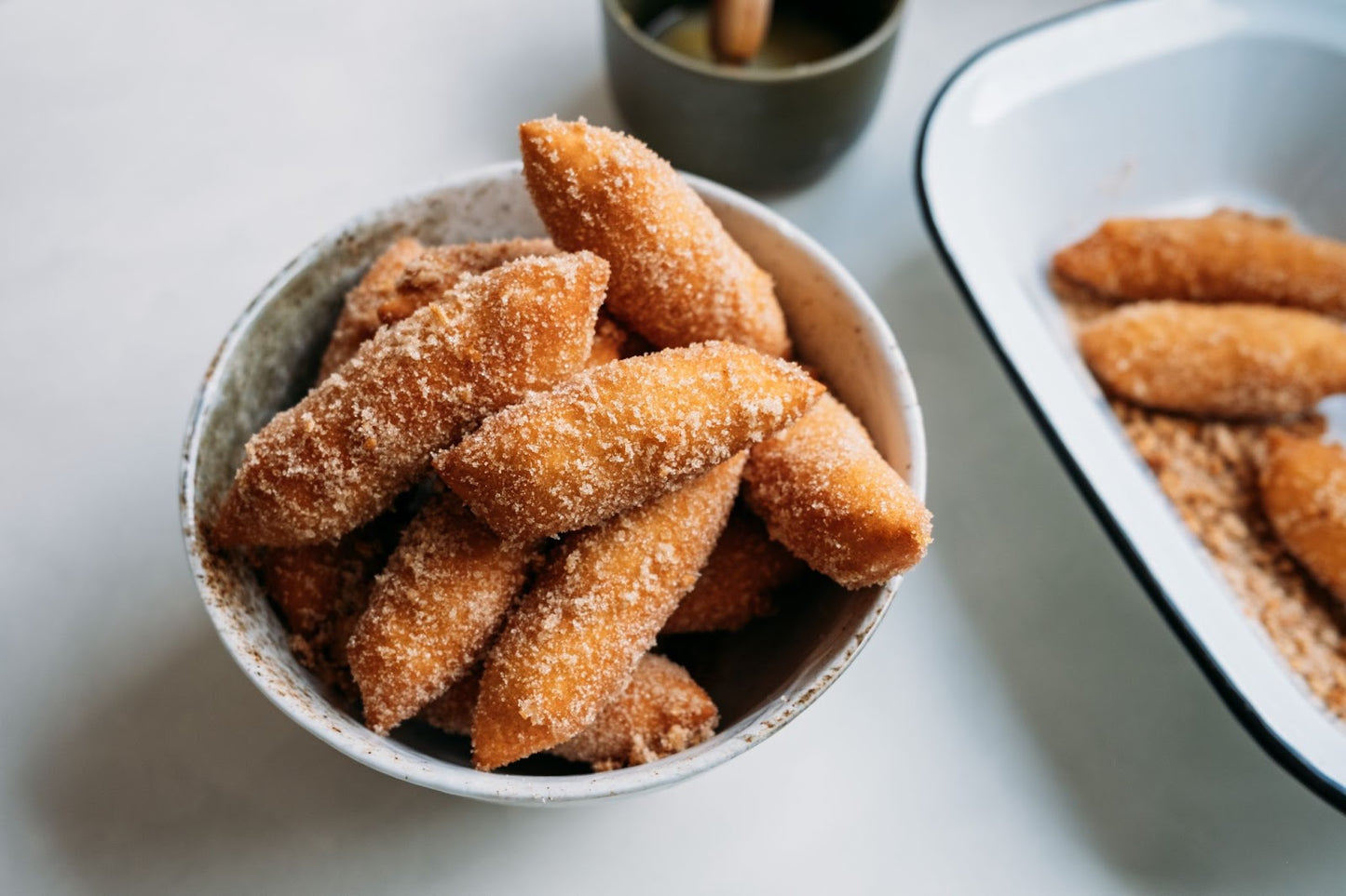 - In the meantime, create the cinnamon & almond sugar by combining golden caster sugar, ground cinnamon, and crushed toasted almonds in a shallow dish.