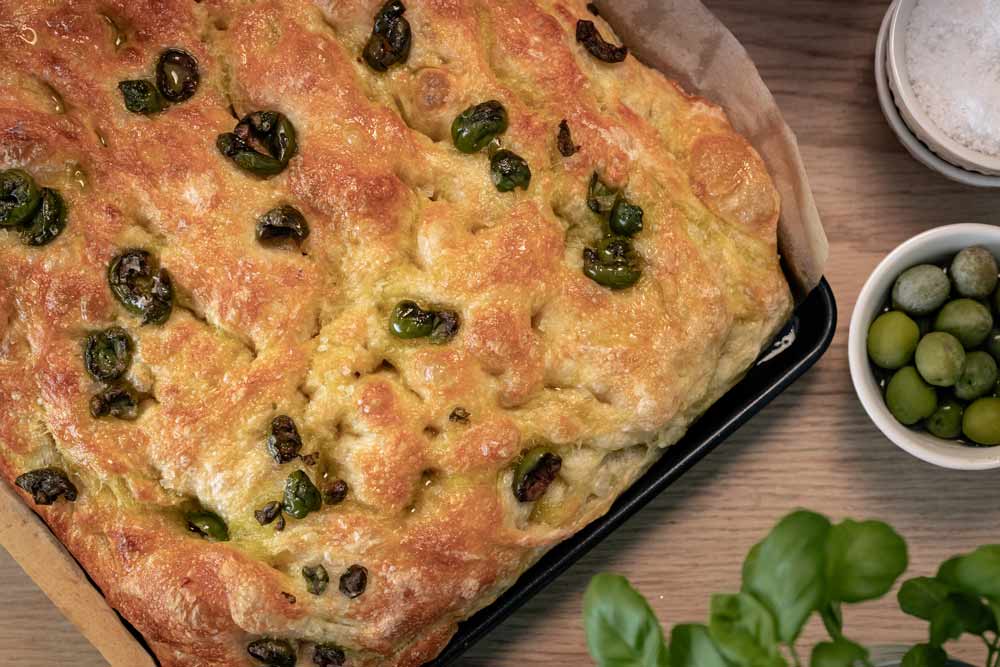 Gently tip the dough out onto the lined baking tray and drizzle it with a bit more olive oil. Over the next hour, use your fingers to ‘dimple’ the dough 3 times. Repeating this process with small resting periods in between means the gas cells will inflate well and you’ll get a delicious ripple of olive oil through the focaccia.