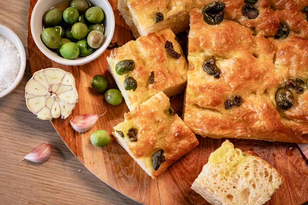 Top the focaccia with the marinated olives and garlic, leaving the lemon peels behind. Drizzle with more olive oil from the saucepan and sprinkle over a little flaky sea salt.
