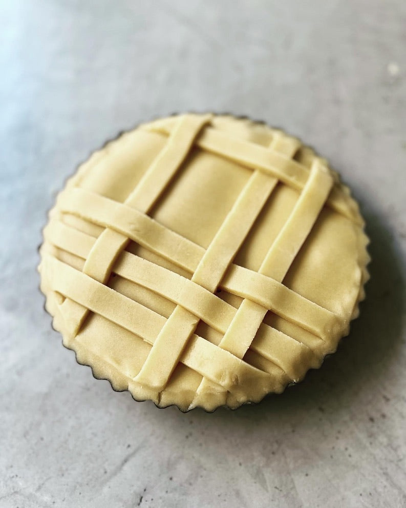 - Make your pastry lid by rolling out the trimmings, again to about the thickness of a one-pound coin. Cut a disk a little bigger than the pie dish and, leaving it on the paper and using the remaining pastry, get creative! I have gone for a simple tartan look by weaving thin strands together, but you could use cutters to add flowers, or petals, or words, get your imagination going.