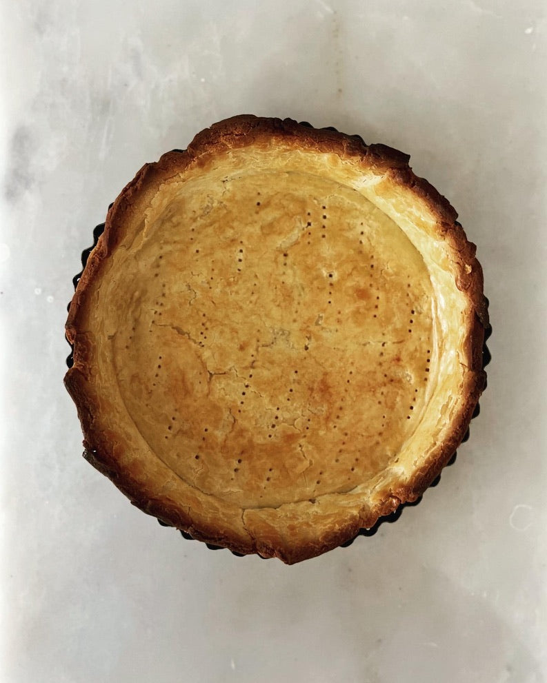- Poke a few holes in the base of the pastry crust, line with the other piece of baking paper, fill with baking beans and pop in the oven for 20 minutes.