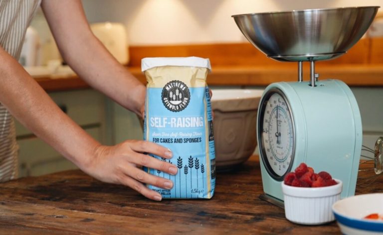 - Mix in the self raising flour, followed by the ground almonds and gently stir in the milk and the double cream followed by the strawberries and raspberries.