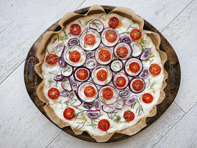 6. Toppings: for a classic focaccia sprinkle some coarse sea salt and fresh rosemary; for an Italian southern style some cherry tomatoes, season with oil and oregano and finish with a pinch of coarse salt.