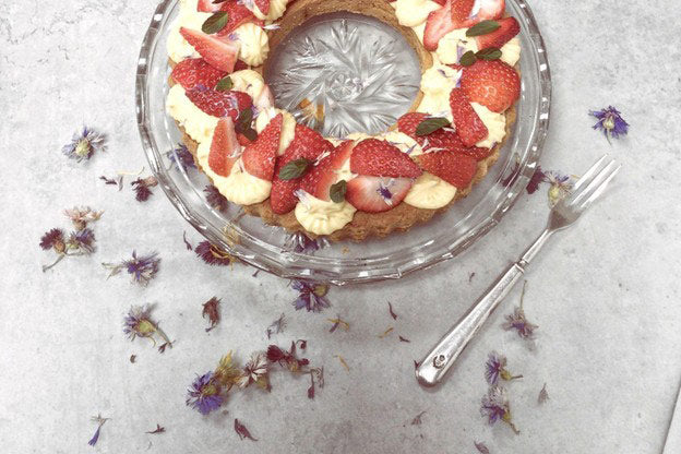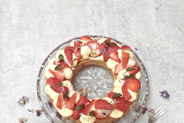 - To assemble: place blobs of cream all around the sable ring, then place strawberries in hand around the cream. Finish with a few edible flowers or pigs of mint. Keep in the fridge until you're ready to eat.