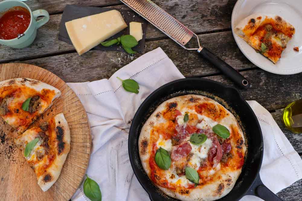 Remember to use an oven safe frying pan or skillet - you can also swap out a pan for a sufficiently deep oven tray - and be sure to use adequate safety gear to protect you from hot handles! If you need to serve multiple pizzas in a rush, it helps to have more than one pan on the go at any given time too. We hope you enjoy, and please share your results if you give this deep dish pizza recipe a go at home!