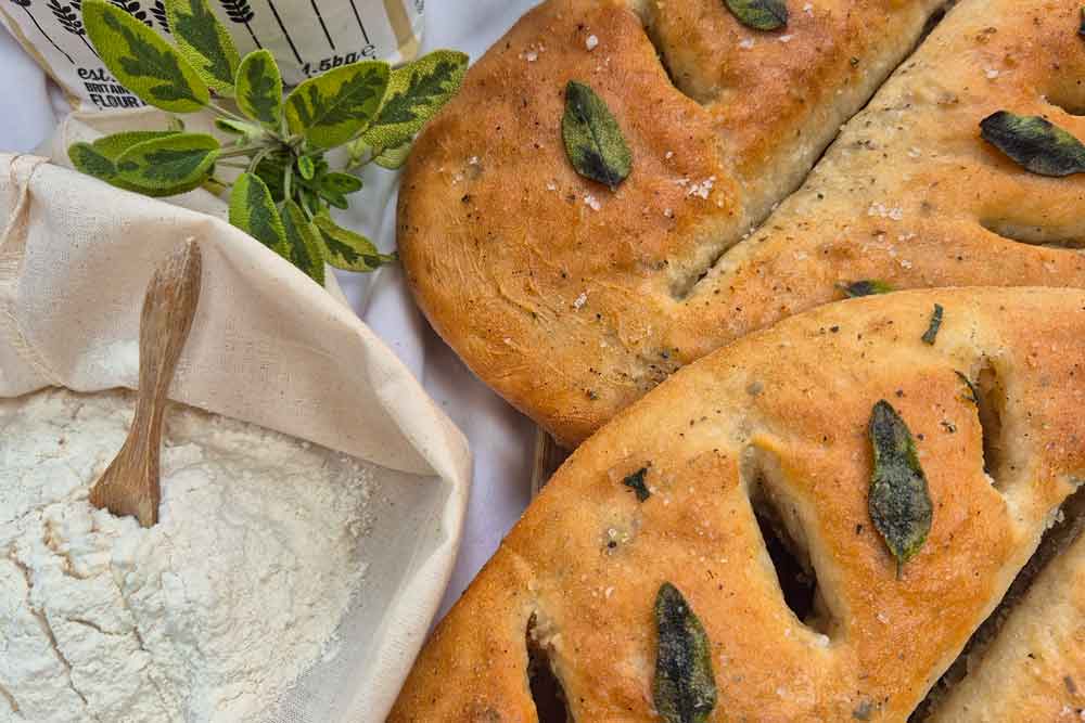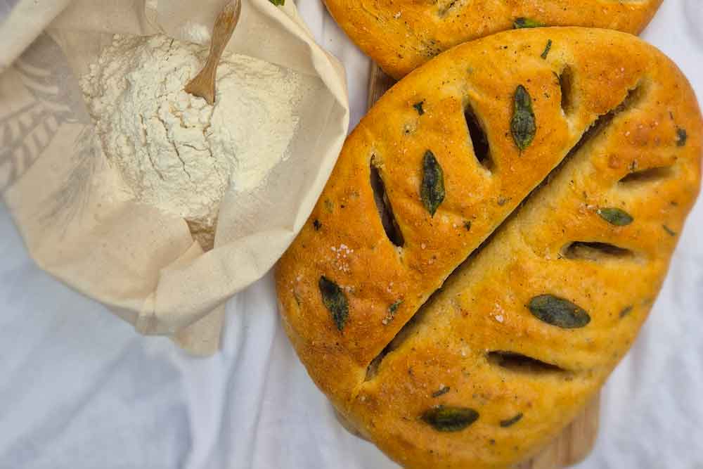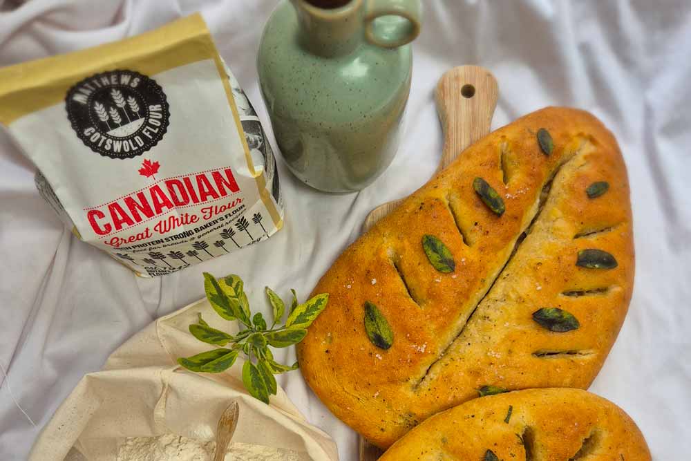 - Once the fougasse have proved, drizzle with olive oil and sprinkle with sea salt and place into the oven to bake for 15-20 minutes until lightly golden and sounding hallow.