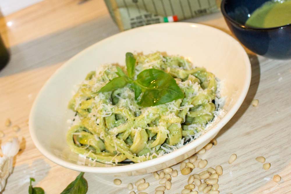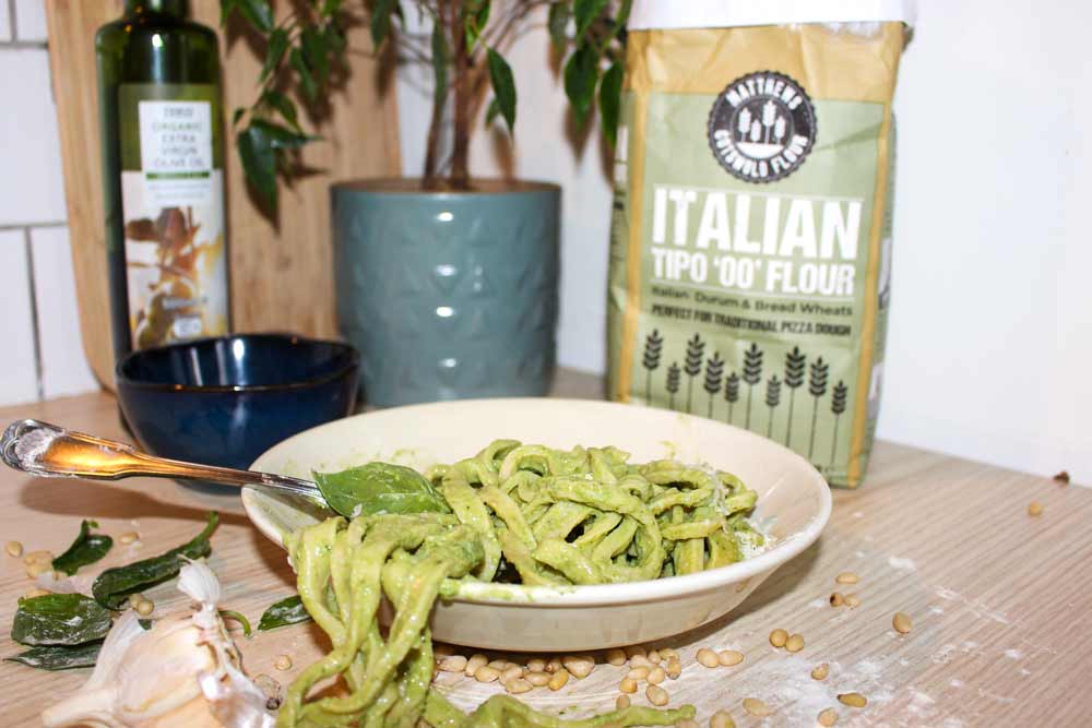 "This delicious fresh pasta is made with only two ingredients - flour and eggs. Complimented with my rich and tasty homemade pesto. The perfect homemade meal and tastes so much better than store bought pesto!"