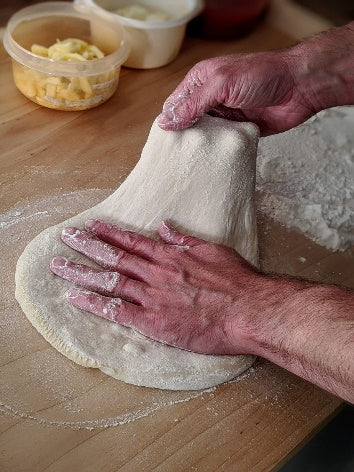 - Tip out a dough ball onto a floured worktop and from the centre, carefully push out to form a one-inch crust. From this point try not to touch this crust as it will affect the rise you get when cooking. Stretch the dough by carefully pulling with one hand and holding the dough down with the other. Keep turning the dough 90 degrees repeating this stretch technique until you reach the 11-inch diameter.