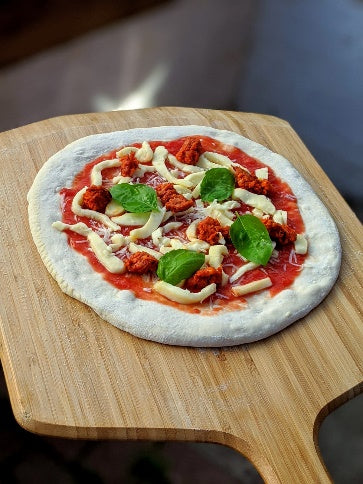 - Transfer the stretched dough onto a floured pizza peel before adding the tomato sauce, grated grana padano, mozzarella, nduja, a drizzle of extra virgin olive oil and the fresh basil leaves.