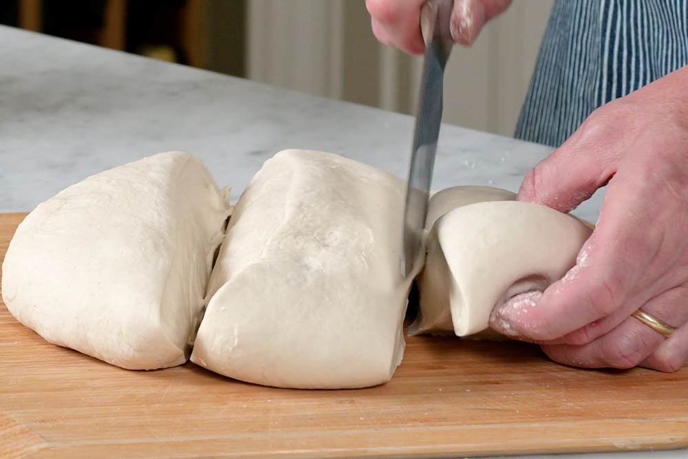 At 8am the next morning, empty the dough from your container out onto a work surface and divide it into 6 x 275g dough balls.
