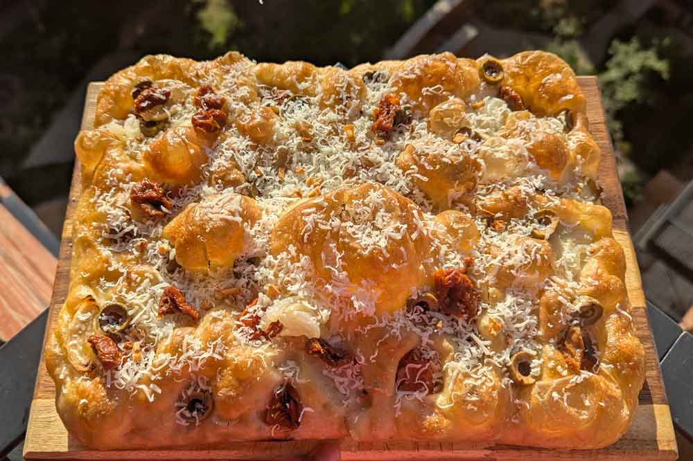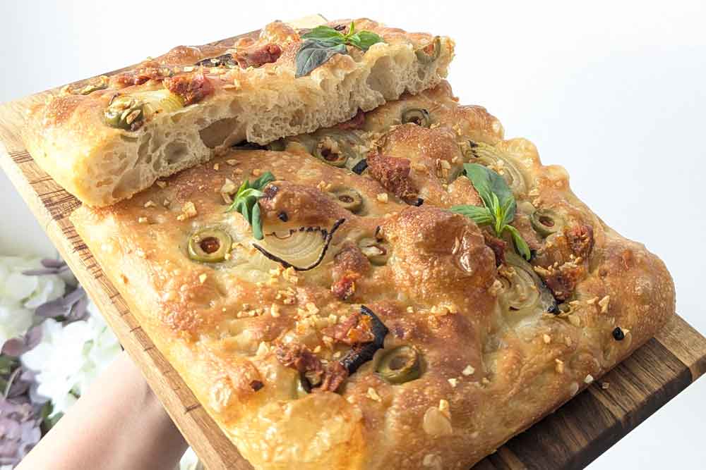 - Once out of the oven brush with butter/oil and allow the focaccia to rest a bit.