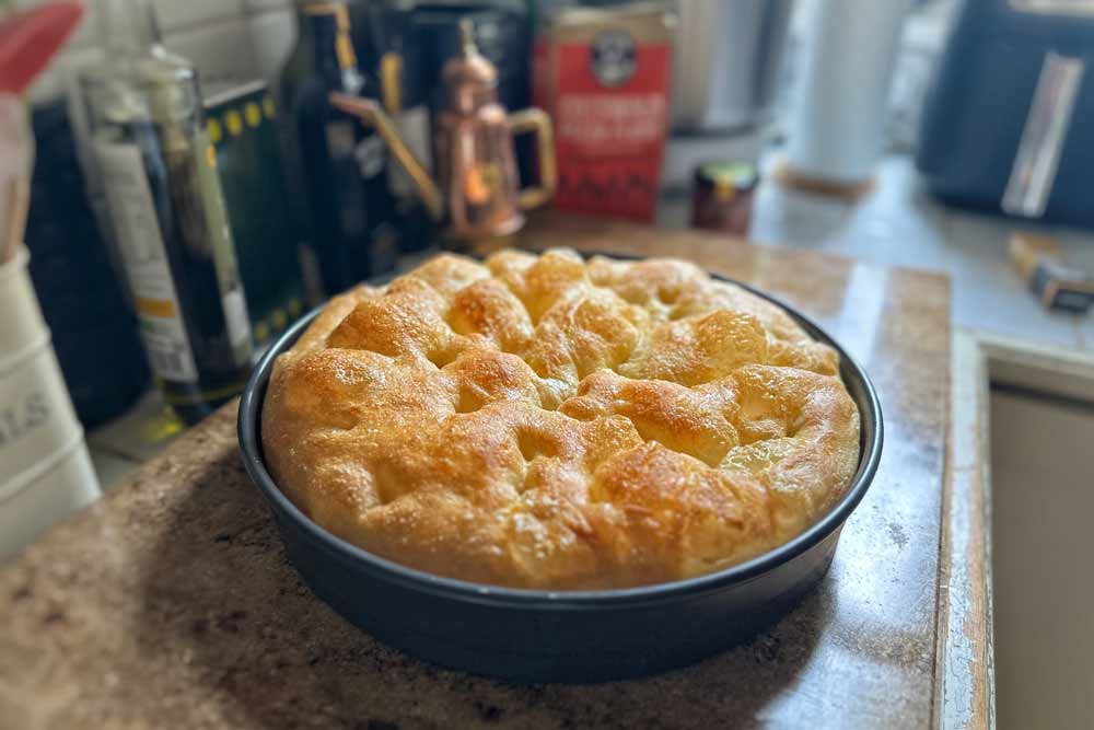 After 25 minutes remove your golden focaccia from the oven and place on a heat proof work surface.