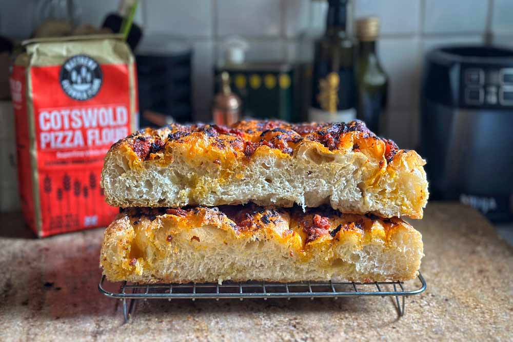"This focaccia was made using Cotswold Pizza Flour. It’s amazing flour and can handle 80% hydration for this focaccia recipe. (When I use this flour for pizza dough I normally keep it to 62%- 65% hydration.)"
