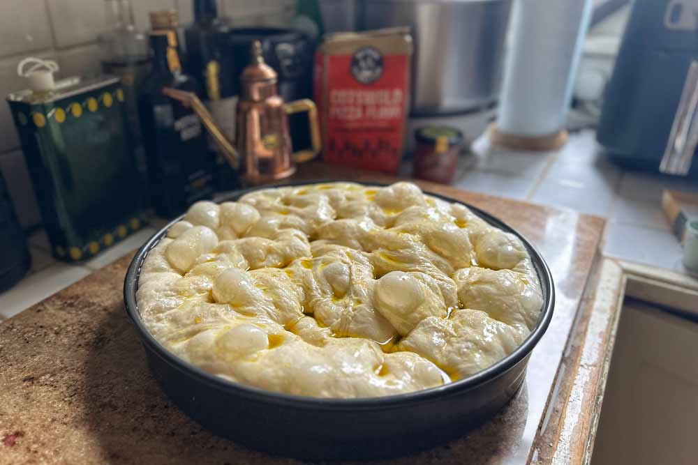 At 9am the next day (or two hours before you wish to bake) remove your dough from the fridge, get your baking pan ready. I like to pour a big glug of olive oil into the pan and then rub it all around the pan making sure its fully covered in oil, then I add another generous glug of olive oil to the pan and roughly spread it across the base of my pan with my fingers.