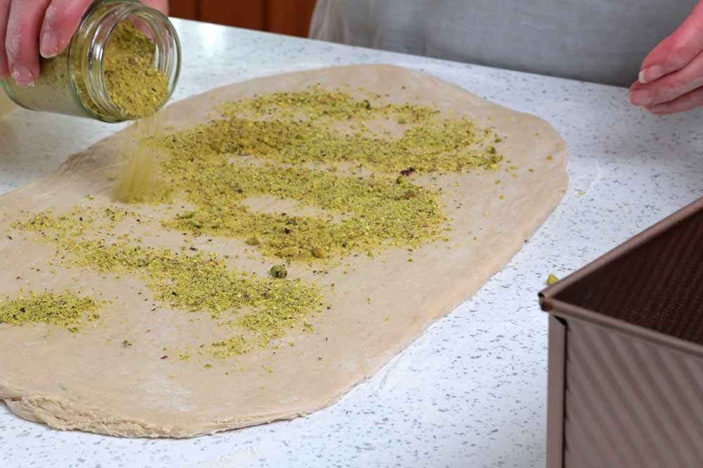- Once rolled out, place the rectangle of pistachio dough on top of the plain dough. Cover the surface evenly with pistachio cream and the remaining whole pistachios and chocolate chips.
