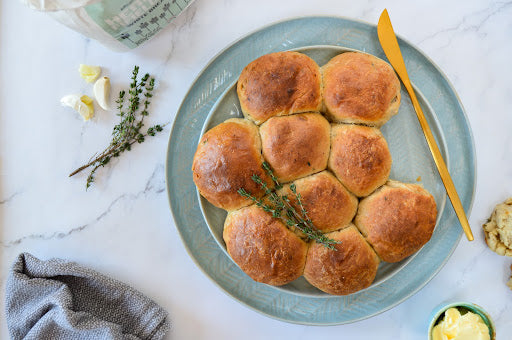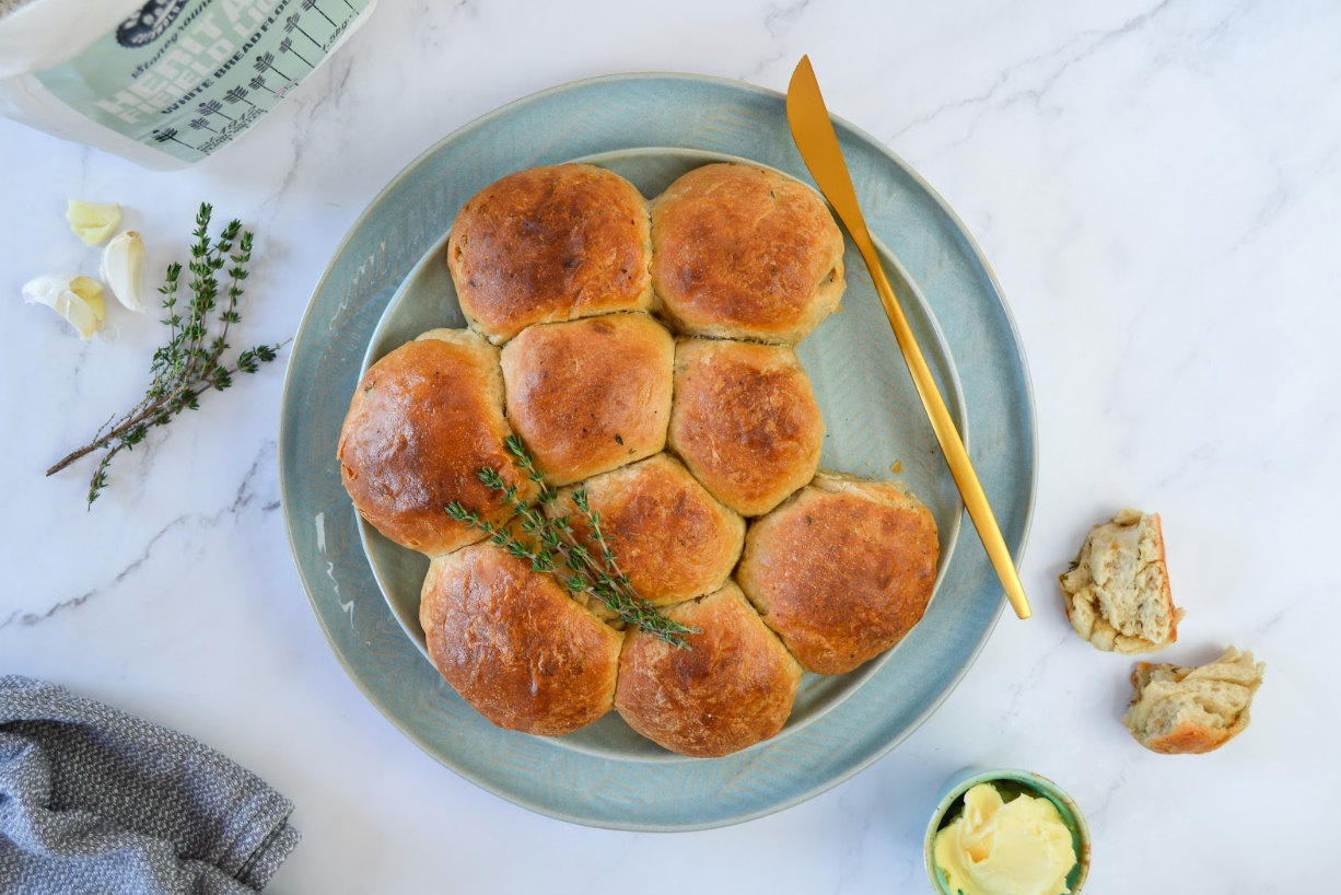 - Roll out the dough to a rectangle of 45 x 25 cm. Spread the butter and sprinkle some garlic granules and thyme leaves.