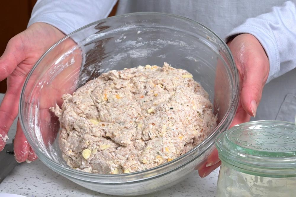 In a large mixing bowl, using a strong spatula or your hand mix together all the ingredients to create a soft, sticky dough, do not overmix.