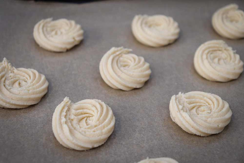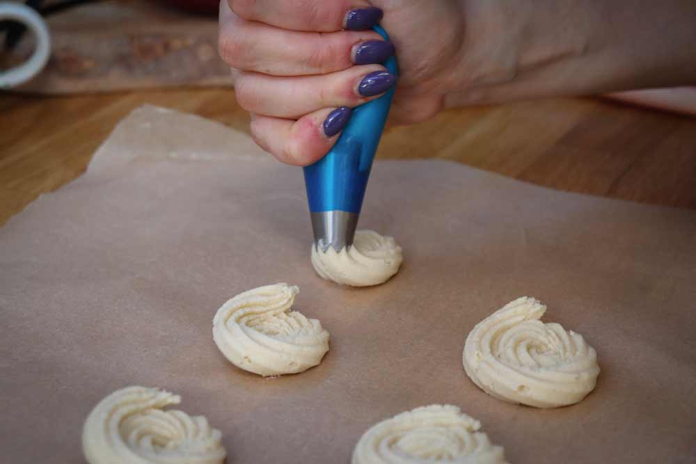 - Put the biscuit mix into a piping bag fitted with a star nozzle and pipe small rosettes onto a lined baking sheet. I like to aim for about 2 inches across.
