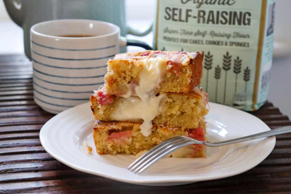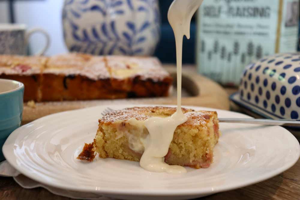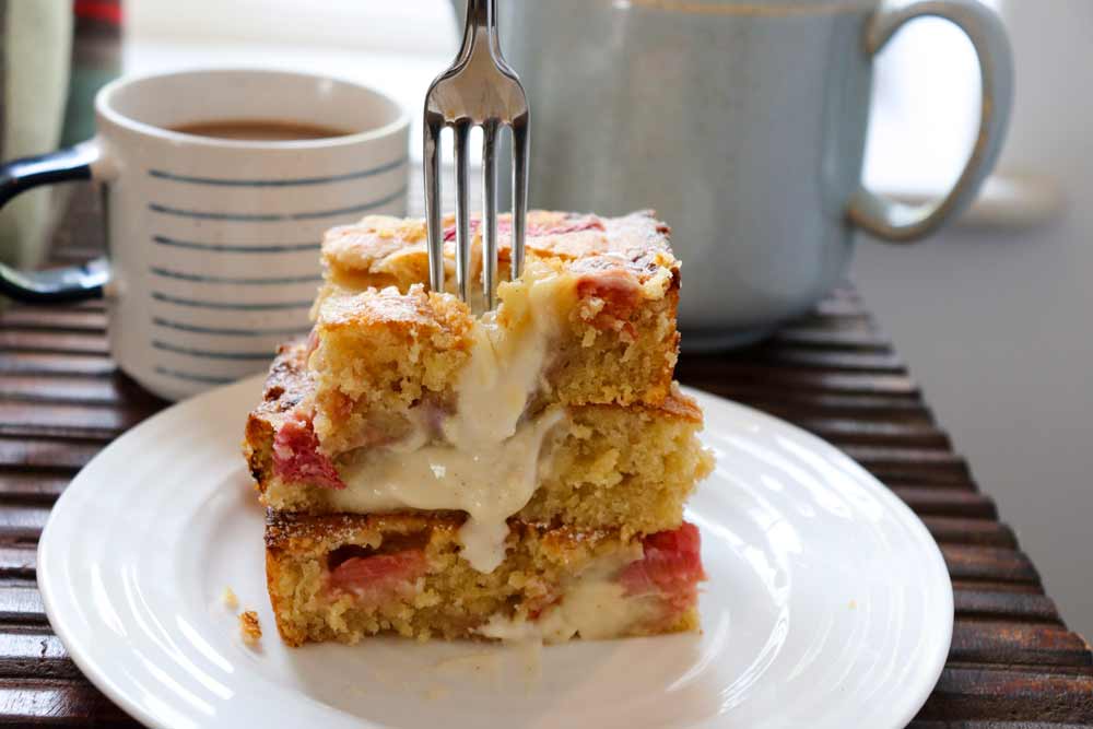 - Gently place the remaining rhubarb on the surface of the cake, and then use a wet tablespoon to press into the unbaked cake periodically - you want to create about 10 divots for the custard to sit in.