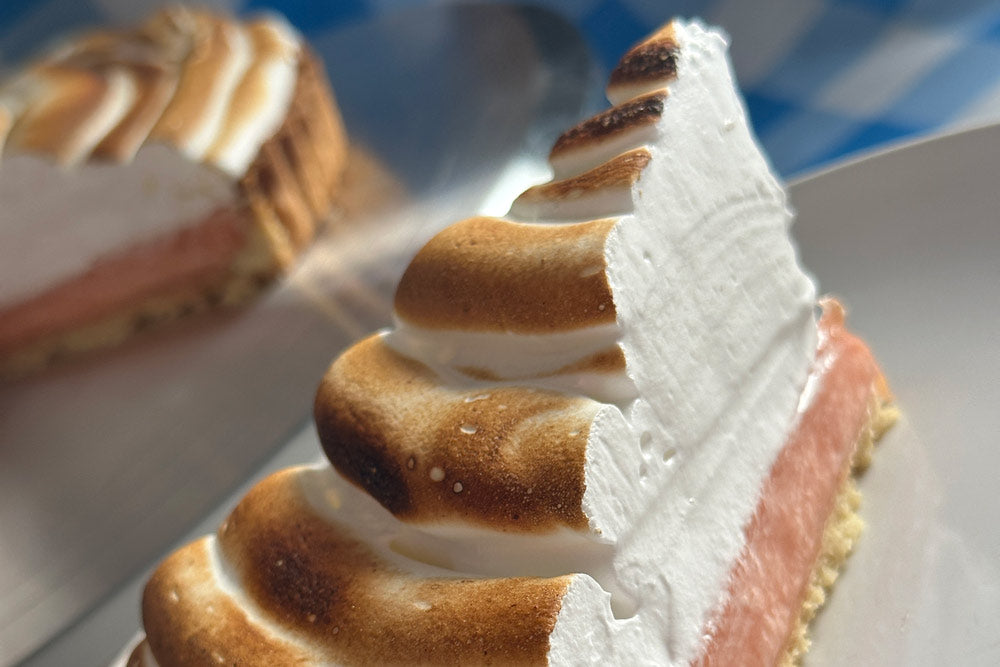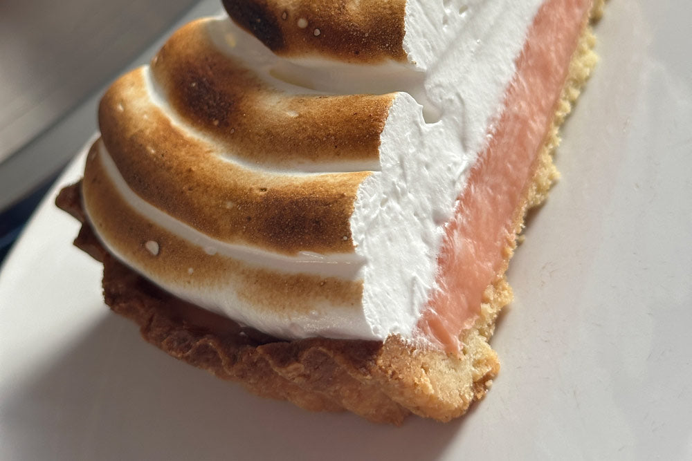 The combination of sweet/tart Pink Rhubarb pairs perfectly with the marshmallow sweetness of the white torched toasty Meringue, sitting inside a crisp pastry shell. This is certainly one to impress on the dinner table!