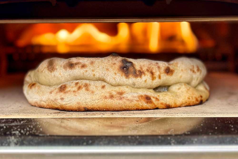 - Place upon a pizza peel and launch into your pizza oven (oven should be around 400ºC/752°F) - watch your Sarnie as it puffs up in the oven (around 60 secs).