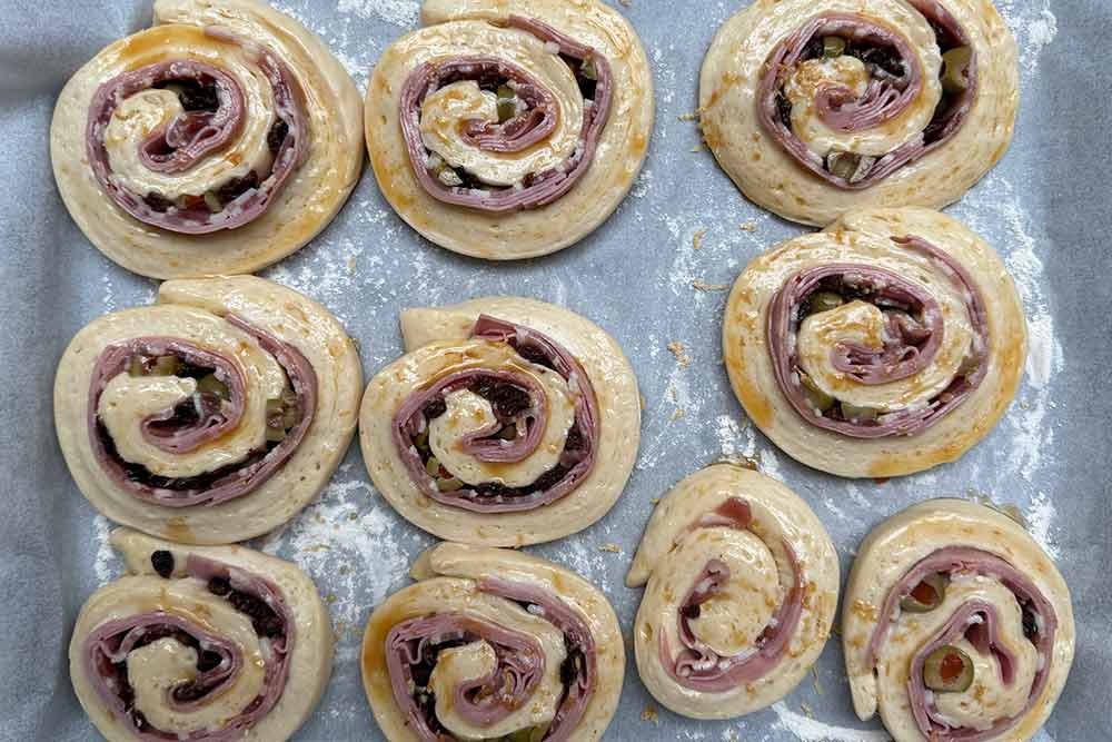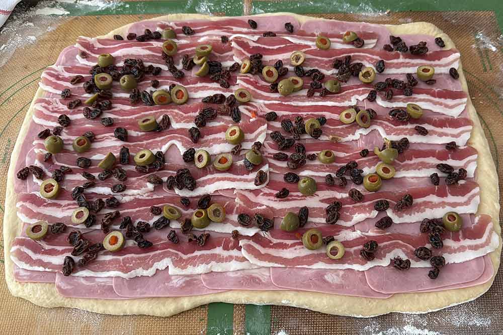 - Add the ham all over the dough leaving 1 cm of dough uncovered around the borders. Ham slices must overlap each other.