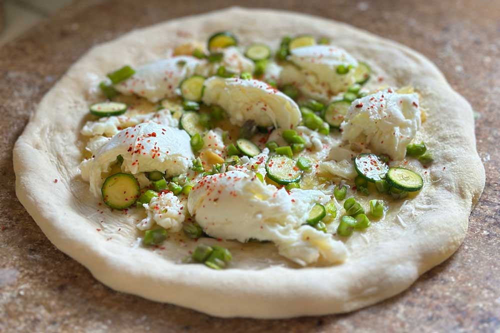 - Grab a ball of Buffalo mozzarella, tear it into pieces and add to the pizza.