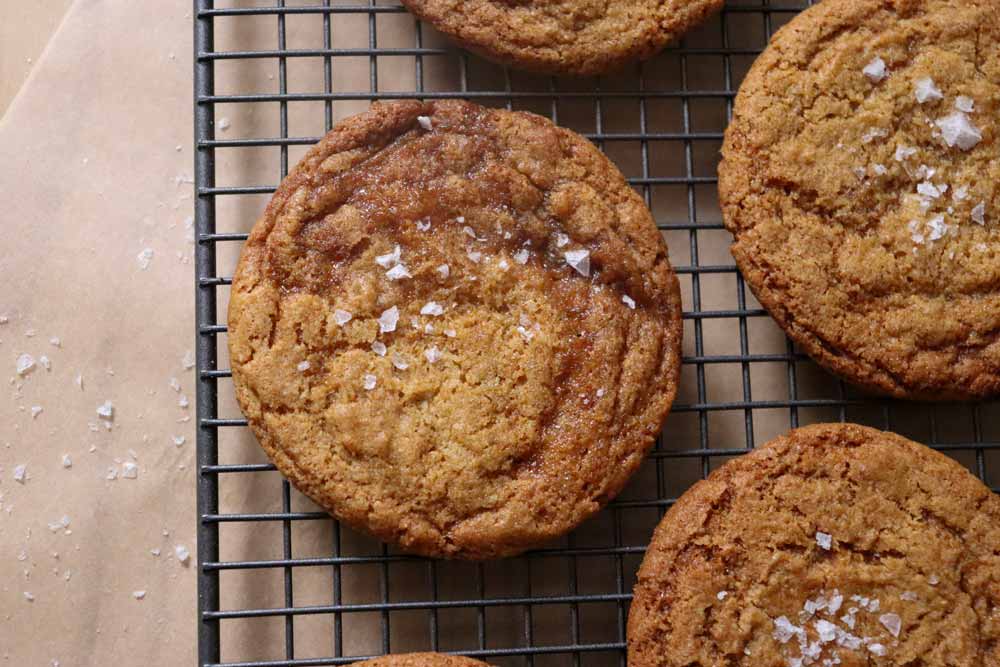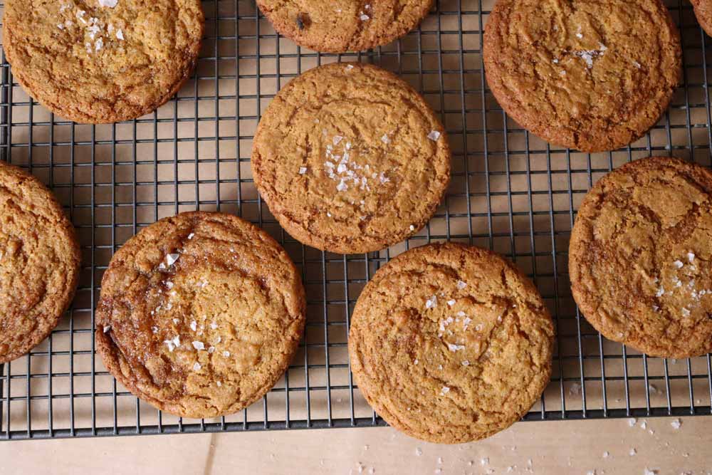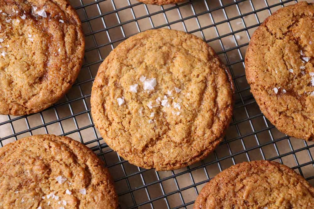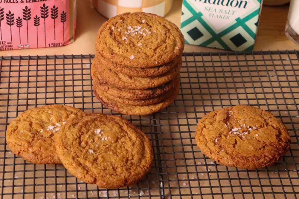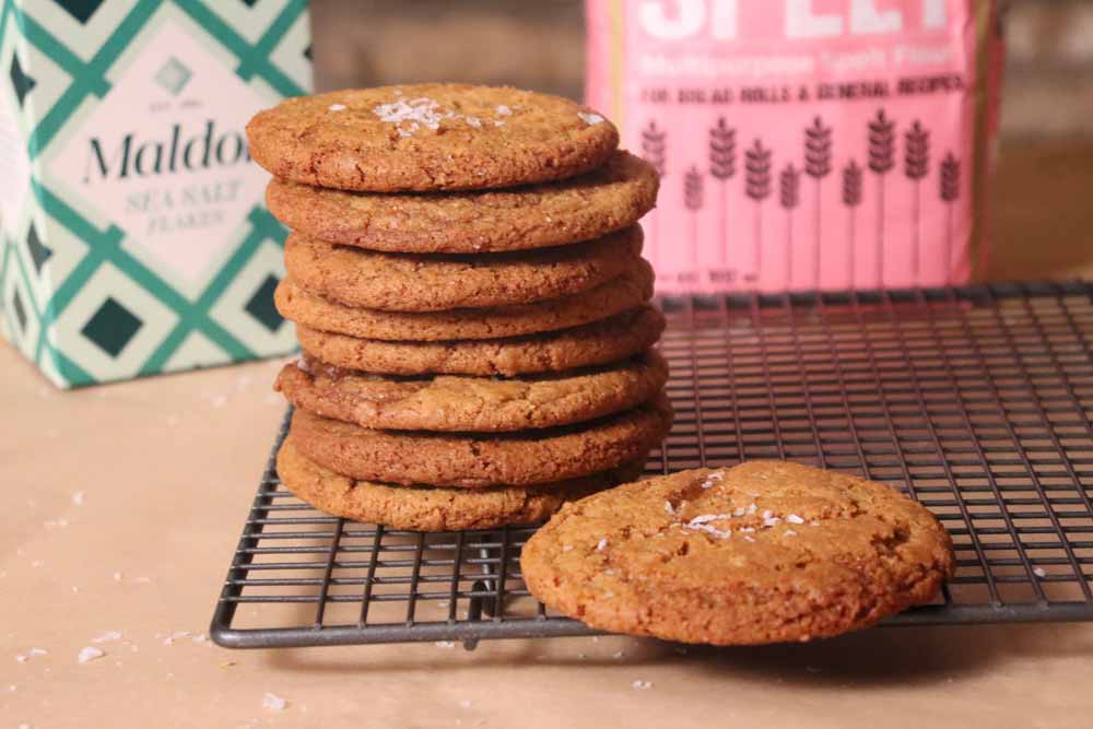 - When the cookies are lightly golden brown around the edges, remove them from the oven and sprinkle with Maldon Sea Salt Flakes.