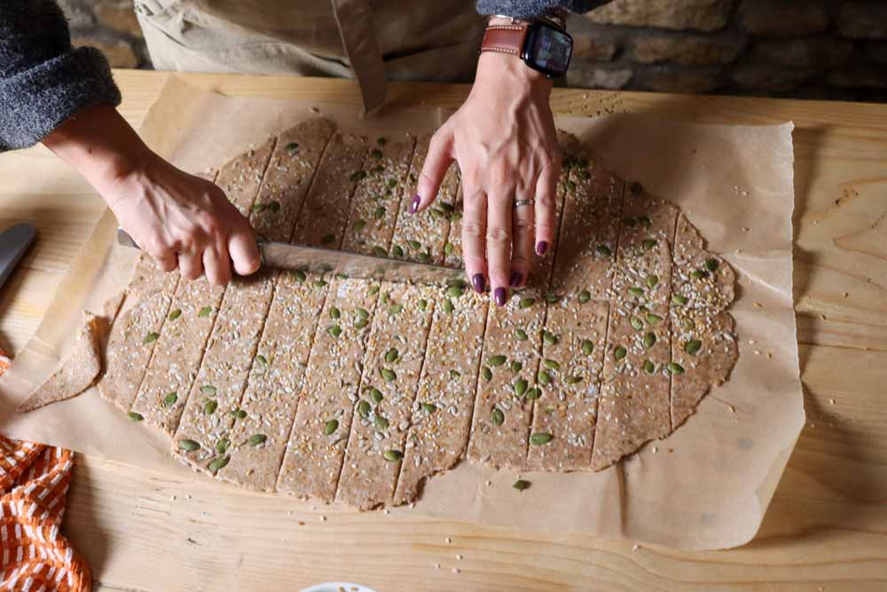- Cut the crackers into your desired shape using a sharp knife or a cookie cutter, then transfer them onto the baking tray.