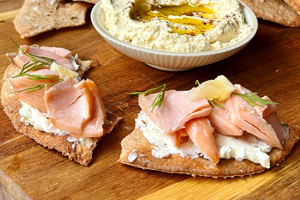 - Enjoy with cream cheese and smoked salmon, or break into smaller pieces and dip in delicious hummus, sprinkled with sumac.