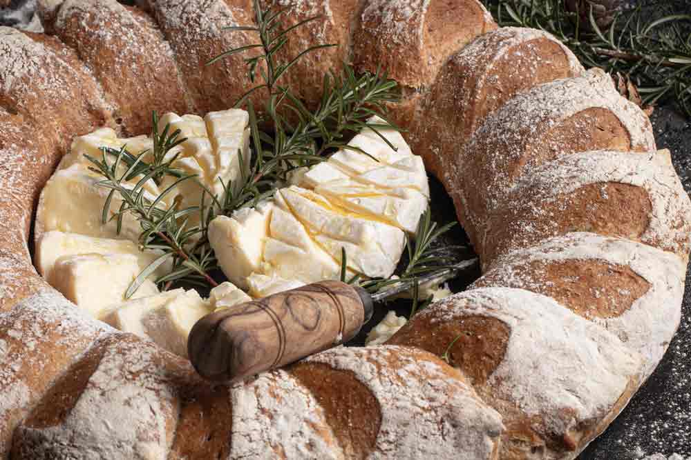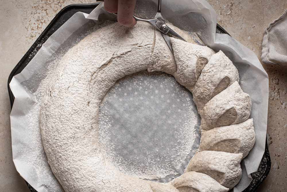 - Form a ring with the rolled dough, squeezing the ends together and place on a lined baking tray. Dust all over with flour. Leave to rest for 15 minutes. With kitchen scissors make a cut on the top surface of the dough ring, pointing downwards at a 45° angle, and using the full length of the blade.