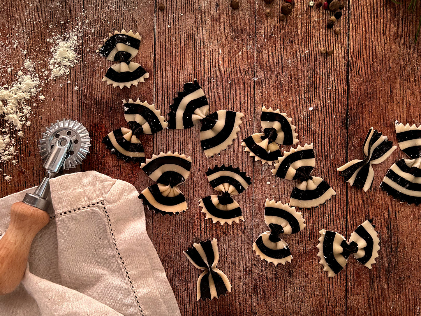 - Use a pastry brush to slightly dampen the surface of your white pasta dough and evenly space the black strips across your white dough to make stripes - don’t use too much water or it may stick to your roller, you need just enough to stick the stripes down