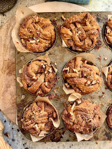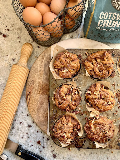 - Add an egg and milk wash to the top of the buns, you don’t need much. Sprinkle over the demerara sugar and pecans, add as much as you’d like! Then put in the hot oven for 18 minutes. Once cooled, enjoy!