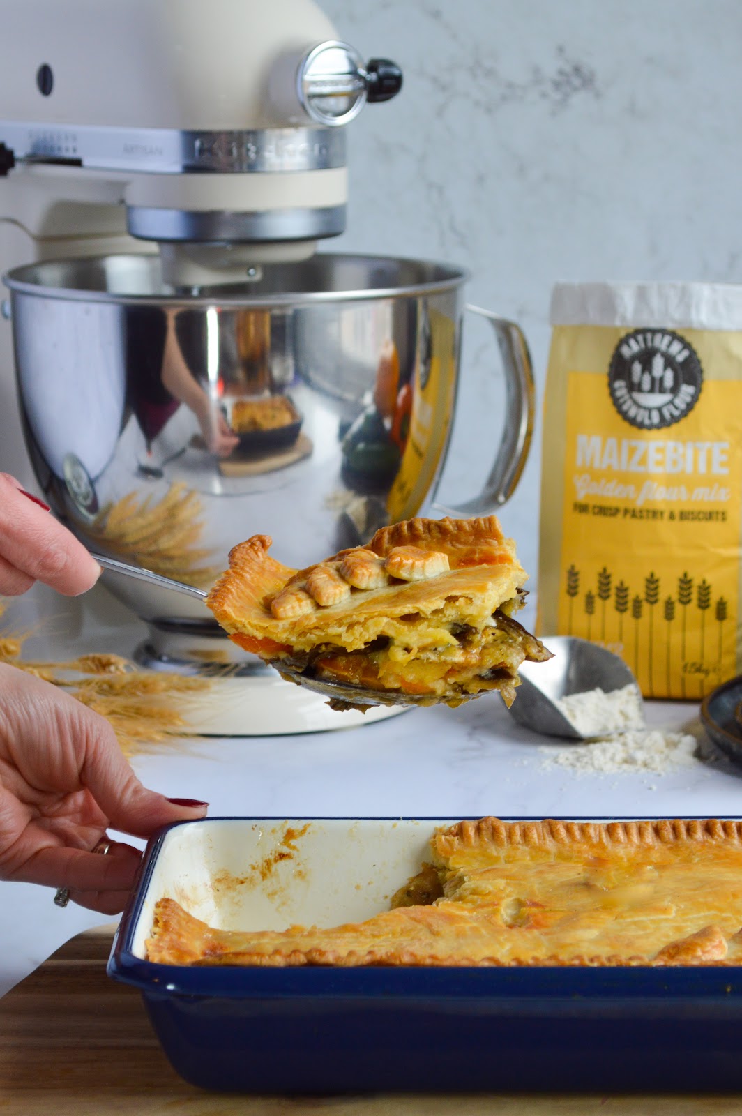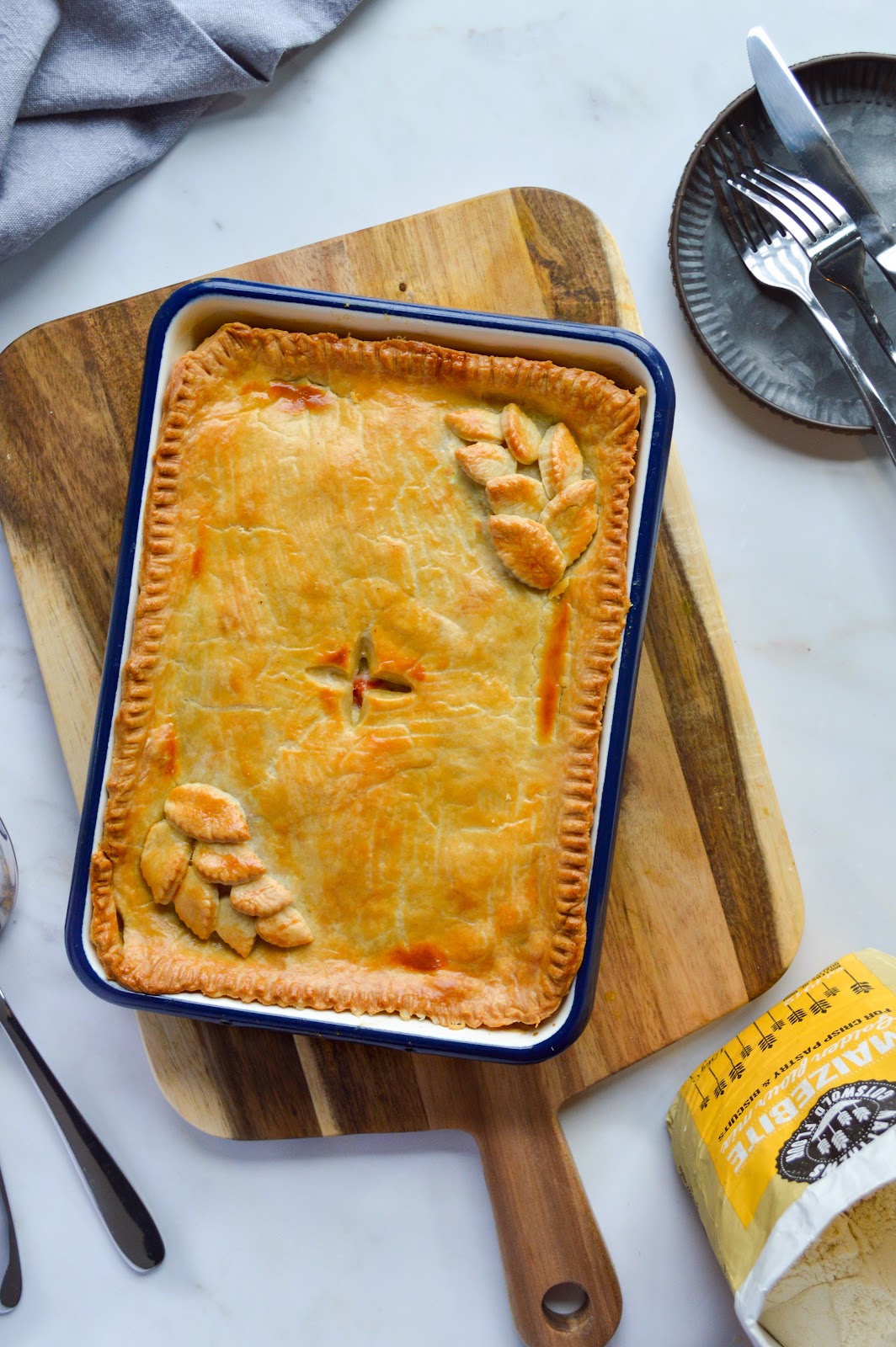 - Roll one half of the pastry out thinly on a lightly floured surface to a rectangle big enough to cover a buttered 25cm x 20cm x 5cm metal pie dish.