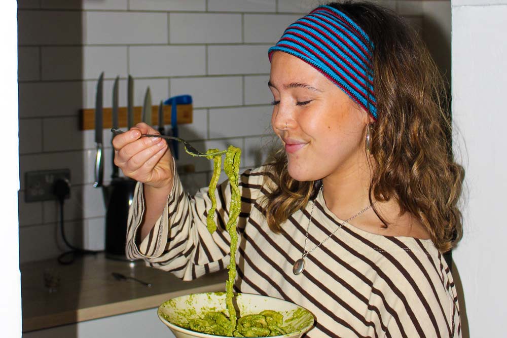 - Blend a bag of basil leaves, a handful of pine nuts, two cloves of garlic, Olive Oil, pinch of salt, a generous amount of grated parmesan and a squeeze of lemon juice to balance the flavours, keep tasting until you have your desired pesto flavour! You want your pesto to have a smooth silky texture!