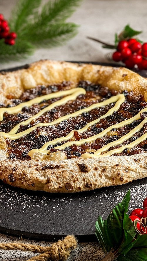 Recipe introduction: Nothing says Christmas in the UK like a mince pie and custard! This recipe is my pizza version of this classic dish and whilst it might sound crazy combining the two, it really does work perfectly! The steps below will guide you through making, stretching and topping the dough as well as how to cook the pizza in a pizza oven.