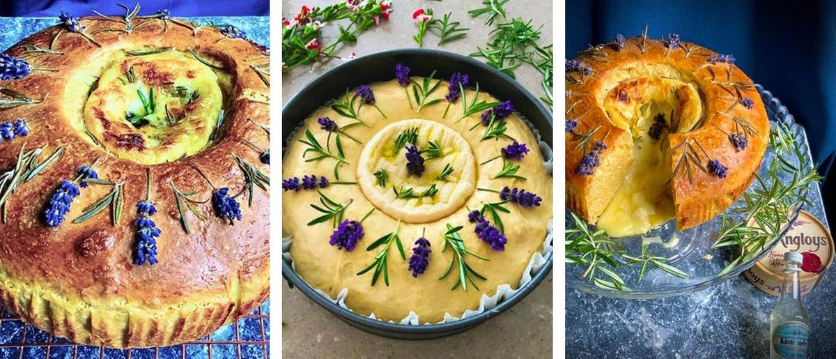 Decorate the surrounding dough with fresh lavender heads and rosemary, not just for decoration, they will infuse the dough with their flavour too.