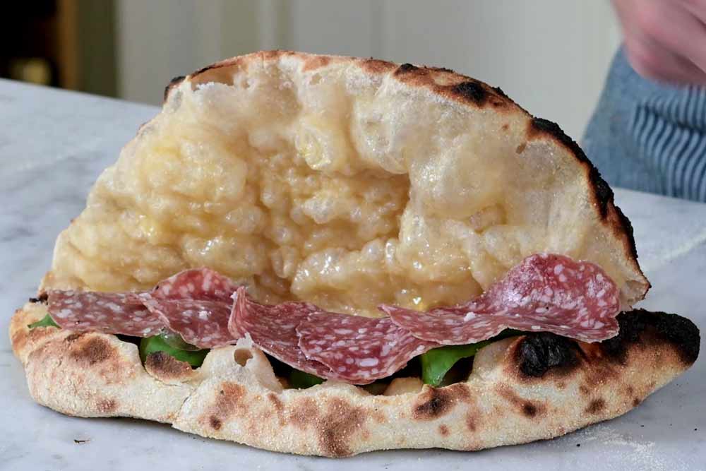 Slide your dough onto your peel and launch into the centre of your preheated Ooni pizza oven (430ºc). This is the best part! Just watch your dough puff up as the air inside it expands with the heat. It will take about 60-90seconds for this to bake, and when the top of the puffed-up sandwich starts to brown, remove it from the oven and place on a wire rack to cool.