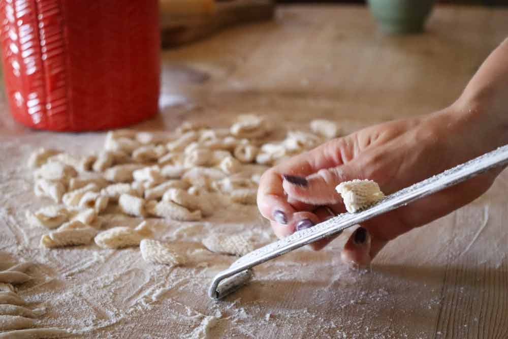 - You can now shape this into any pasta shape you like - there are lots of things lying around the average house that can be used to help shape pasta. I like using my cheese grater. Pinch off a piece of dough about the size of a marble, then lightly flour it by dipping it into a little pot of flour. Use your thumb to press the ball of dough into the small grate side of your cheese grater and then roll the ball down, keeping pressure. This will flatten the ball and create little spikes in one side which help to catch the sauce.