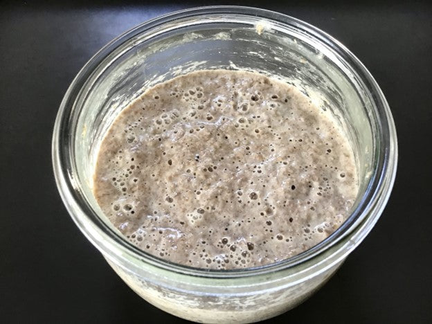This is an example of a wholemeal sourdough starter. Wholewheat sourdough starters are full of texture and flavour. They can lead to a more flavoursome and sometimes more sour loaf of bread. As starters they grow wonderfully. You can see the full texture in them all the way up the side of the jar! (See image).